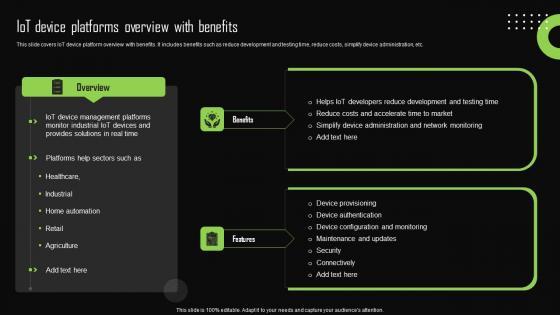 This slide covers IoT device platform overview with benefits. It includes benefits such as reduce development and testing time, reduce costs, simplify device administration, etc. Do you have an important presentation coming up Are you looking for something that will make your presentation stand out from the rest Look no further than IoT Device Management Fundamentals IoT Device Platforms Overview With Benefits IoT SS V. With our professional designs, you can trust that your presentation will pop and make delivering it a smooth process. And with Slidegeeks, you can trust that your presentation will be unique and memorable. So why wait Grab IoT Device Management Fundamentals IoT Device Platforms Overview With Benefits IoT SS V today and make your presentation stand out from the rest This slide covers IoT device platform overview with benefits. It includes benefits such as reduce development and testing time, reduce costs, simplify device administration, etc.