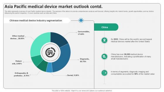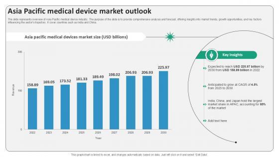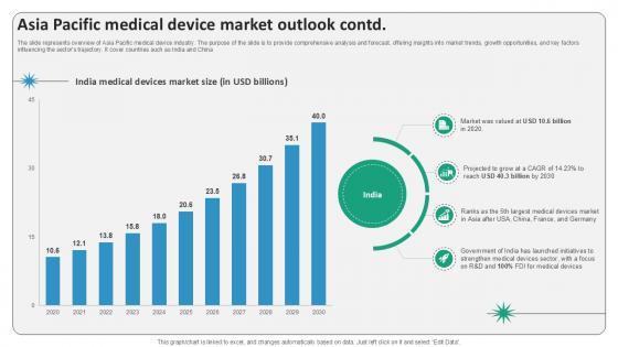 The slide represents overview of Asia Pacific medical device industry. The purpose of the slide is to provide comprehensive analysis and forecast, offering insights into market trends, growth opportunities, and key factors influencing the sectors trajectory. It cover countries such as India and China. Create an editable ASIA Pacific Medical Device Market Outlook Surgical Devices Ppt Example IR SS V that communicates your idea and engages your audience. Whether you are presenting a business or an educational presentation, pre-designed presentation templates help save time. ASIA Pacific Medical Device Market Outlook Surgical Devices Ppt Example IR SS V is highly customizable and very easy to edit, covering many different styles from creative to business presentations. Slidegeeks has creative team members who have crafted amazing templates. So, go and get them without any delay. The slide represents overview of Asia Pacific medical device industry. The purpose of the slide is to provide comprehensive analysis and forecast, offering insights into market trends, growth opportunities, and key factors influencing the sectors trajectory. It cover countries such as India and China.