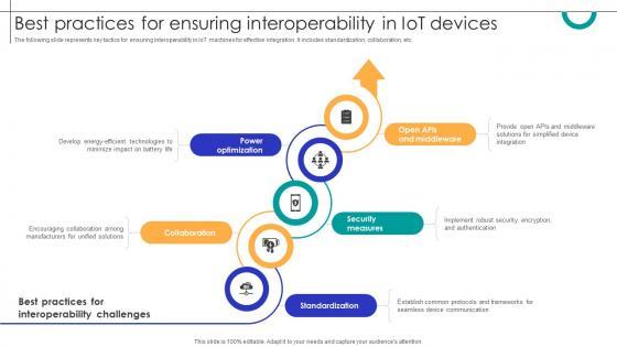 The following slide represents key tactics for ensuring interoperability in IoT machines for effective integration. It includes standardization, collaboration, etc. Slidegeeks is here to make your presentations a breeze with Best Practices For Ensuring Interoperability In IOT Devices Streamlining Production Ppt Example With our easy-to-use and customizable templates, you can focus on delivering your ideas rather than worrying about formatting. With a variety of designs to choose from, you are sure to find one that suits your needs. And with animations and unique photos, illustrations, and fonts, you can make your presentation pop. So whether you are giving a sales pitch or presenting to the board, make sure to check out Slidegeeks first The following slide represents key tactics for ensuring interoperability in IoT machines for effective integration. It includes standardization, collaboration, etc.