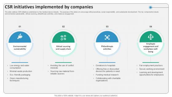 The slide outlines CSR initiatives undertaken by the medical device industry. The purpose of the slide is to encourage ethical practices, social responsibility, and sustainable development. The key components include environmental sustainability, ethical sourcing, philanthropic activities, and employee engagement. From laying roadmaps to briefing everything in detail, our templates are perfect for you. You can set the stage with your presentation slides. All you have to do is download these easy-to-edit and customizable templates. CSR Initiatives Implemented By Companies Surgical Devices Ppt Example IR SS V will help you deliver an outstanding performance that everyone would remember and praise you for. Do download this presentation today. The slide outlines CSR initiatives undertaken by the medical device industry. The purpose of the slide is to encourage ethical practices, social responsibility, and sustainable development. The key components include environmental sustainability, ethical sourcing, philanthropic activities, and employee engagement.