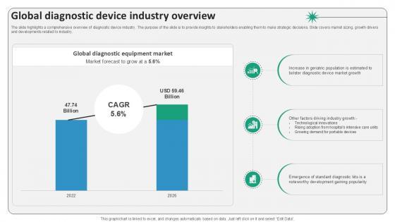 The slide highlights a comprehensive overview of diagnostic device industry. The purpose of the slide is to provide insights to stakeholders enabling them to make strategic decisions. Slide covers market sizing, growth drivers and developments related to industry. Are you in need of a template that can accommodate all of your creative concepts This one is crafted professionally and can be altered to fit any style. Use it with Google Slides or PowerPoint. Include striking photographs, symbols, depictions, and other visuals. Fill, move around, or remove text boxes as desired. Test out color palettes and font mixtures. Edit and save your work, or work with colleagues. Download Global Diagnostic Device Industry Overview Surgical Devices Ppt Example IR SS V and observe how to make your presentation outstanding. Give an impeccable presentation to your group and make your presentation unforgettable. The slide highlights a comprehensive overview of diagnostic device industry. The purpose of the slide is to provide insights to stakeholders enabling them to make strategic decisions. Slide covers market sizing, growth drivers and developments related to industry.