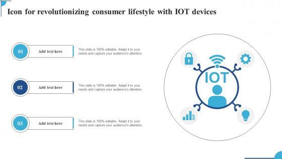 Pitch your topic with ease and precision using this Icon For Revolutionizing Consumer Lifestyle With IOT Devices Ppt Professional Example File Pdf. This layout presents information on Icon For Revolutionizing,Consumer Lifestyle,IOT Devices. It is also available for immediate download and adjustment. So,changes can be made in the color,design,graphics or any other component to create a unique layout. Our Icon For Revolutionizing Consumer Lifestyle With IOT Devices Ppt Professional Example File Pdf are topically designed to provide an attractive backdrop to any subject. Use them to look like a presentation pro.