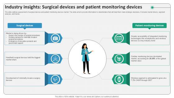 The slide outlines assessment of surgical devices and patient monitoring devices market. The slide aims to provide information to stakeholders that will help them make strategic decisions. It include market drivers, segment analysis, and trends. Coming up with a presentation necessitates that the majority of the effort goes into the content and the message you intend to convey. The visuals of a PowerPoint presentation can only be effective if it supplements and supports the story that is being told. Keeping this in mind our experts created Industry Insights Surgical Devices And Patient Surgical Devices Ppt Example IR SS V to reduce the time that goes into designing the presentation. This way, you can concentrate on the message while our designers take care of providing you with the right template for the situation. The slide outlines assessment of surgical devices and patient monitoring devices market. The slide aims to provide information to stakeholders that will help them make strategic decisions. It include market drivers, segment analysis, and trends.