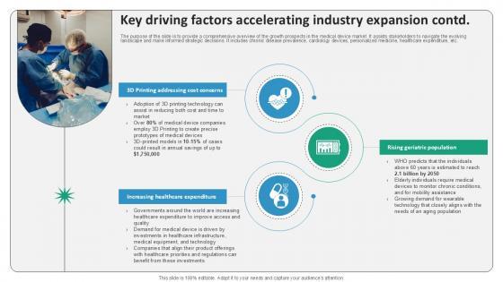 The purpose of the slide is to provide a comprehensive overview of the growth prospects in the medical device market. It assists stakeholders to navigate the evolving landscape and make informed strategic decisions. It includes chronic disease prevalence, cardiology devices, personalized medicine, healthcare expenditure, etc. Explore a selection of the finest Key Driving Factors Accelerating Industry Surgical Devices Ppt Example IR SS V here. With a plethora of professionally designed and pre-made slide templates, you can quickly and easily find the right one for your upcoming presentation. You can use our Key Driving Factors Accelerating Industry Surgical Devices Ppt Example IR SS V to effectively convey your message to a wider audience. Slidegeeks has done a lot of research before preparing these presentation templates. The content can be personalized and the slides are highly editable. Grab templates today from Slidegeeks. The purpose of the slide is to provide a comprehensive overview of the growth prospects in the medical device market. It assists stakeholders to navigate the evolving landscape and make informed strategic decisions. It includes chronic disease prevalence, cardiology devices, personalized medicine, healthcare expenditure, etc.