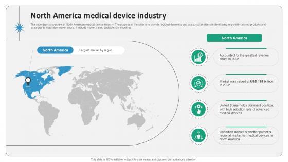 The slide depicts overview of North American medical device industry. The purpose of the slide is to provide regional dynamics and assist stakeholders in developing regionally tailored products and strategies to maximize market share. It include market value, and potential countries Boost your pitch with our creative North America Medical Device Industry Surgical Devices Ppt Example IR SS V. Deliver an awe-inspiring pitch that will mesmerize everyone. Using these presentation templates you will surely catch everyones attention. You can browse the ppts collection on our website. We have researchers who are experts at creating the right content for the templates. So you do not have to invest time in any additional work. Just grab the template now and use them. The slide depicts overview of North American medical device industry. The purpose of the slide is to provide regional dynamics and assist stakeholders in developing regionally tailored products and strategies to maximize market share. It include market value, and potential countries
