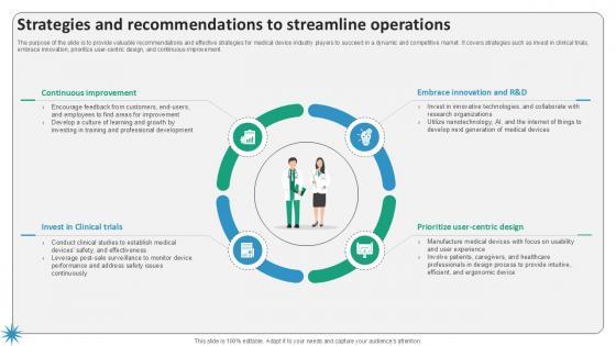 The purpose of the slide is to provide valuable recommendations and effective strategies for medical device industry players to succeed in a dynamic and competitive market. It covers strategies such as invest in clinical trials, embrace innovation, prioritize user-centric design, and continuous improvement. Get a simple yet stunning designed Strategies And Recommendations To Streamline Surgical Devices Ppt Example IR SS V. It is the best one to establish the tone in your meetings. It is an excellent way to make your presentations highly effective. So, download this PPT today from Slidegeeks and see the positive impacts. Our easy-to-edit Strategies And Recommendations To Streamline Surgical Devices Ppt Example IR SS V can be your go-to option for all upcoming conferences and meetings. So, what are you waiting for Grab this template today. The purpose of the slide is to provide valuable recommendations and effective strategies for medical device industry players to succeed in a dynamic and competitive market. It covers strategies such as invest in clinical trials, embrace innovation, prioritize user-centric design, and continuous improvement.