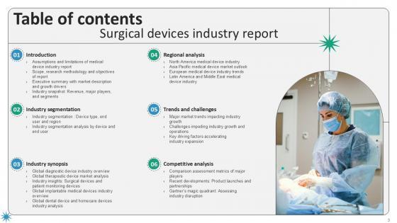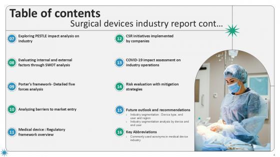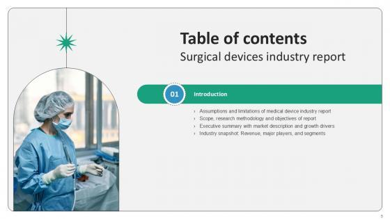 Our Surgical Devices Industry Report powerpoint presentation slides PPT Example IR V Industry Report template is the answer to your concern in presenting complex industry data to your audience. With its editable Industry Report template you can alter the presentation to suit your clients needs and preferences. The versatility of our template makes it suitable for various purposes, ensuring it effortlessly adapts to any situation. You have complete control over your data, allowing you to precisely adjust and customize it to match your industrys needs. With our customizable industry report templates, you can confidently share your data, knowing your audience will be engaged and impressed by how clear and organized your data is. Whether its an executive summary, industry synopsis, or regulatory information, this Industry Report has covered you all. With this Industry Report, your clients will enjoy the complete clarity and you can impress them with precision. Get access to our 100 percent editable PPT that is compatible with Google Slides now. Our Surgical Devices Industry Report powerpoint presentation slides PPT Example IR V are topically designed to provide an attractive backdrop to any subject. Use them to look like a presentation pro.