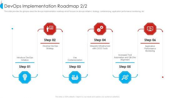 This slide provides the glimpse about the devops implementation roadmap which focuses on devops initiative, strategy, containerizing, application performance monitoring, etc.Presenting devops implementation roadmap topics pdf to provide visual cues and insights. Share and navigate important information on six stages that need your due attention. This template can be used to pitch topics like organizing a devops initiative, devops strategy, containerizing. In addtion, this PPT design contains high resolution images, graphics, etc, that are easily editable and available for immediate download.