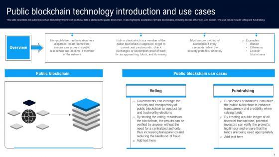 This slide describes the public blockchain technology framework and how data is stored in the public blockchain. It also highlights examples of private blockchains, including bitcoin, ethereum, and litecoin. The use cases include voting and fundraising. Present like a pro with Public Blockchain Technology Different Architectures Of Blockchain Infographics Pdf Create beautiful presentations together with your team, using our easy to use presentation slides. Share your ideas in real time and make changes on the fly by downloading our templates. So whether you are in the office, on the go, or in a remote location, you can stay in sync with your team and present your ideas with confidence. With Slidegeeks presentation got a whole lot easier. Grab these presentations today. This slide describes the public blockchain technology framework and how data is stored in the public blockchain. It also highlights examples of private blockchains, including bitcoin, ethereum, and litecoin. The use cases include voting and fundraising.