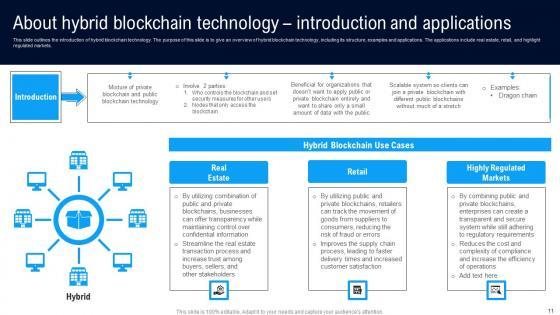 This slide outlines the introduction of hybrid blockchain technology. The purpose of this slide is to give an overview of hybrid blockchain technology, including its structure, examples and applications. The applications include real estate, retail, and highlight regulated markets. Presenting this PowerPoint presentation, titled About Hybrid Blockchain Technology Different Architectures Of Blockchain Background Pdf, with topics curated by our researchers after extensive research. This editable presentation is available for immediate download and provides attractive features when used. Download now and captivate your audience. Presenting this About Hybrid Blockchain Technology Different Architectures Of Blockchain Background Pdf. Our researchers have carefully researched and created these slides with all aspects taken into consideration. This is a completely customizable About Hybrid Blockchain Technology Different Architectures Of Blockchain Background Pdf that is available for immediate downloading. Download now and make an impact on your audience. Highlight the attractive features available with our PPTs. This slide outlines the introduction of hybrid blockchain technology. The purpose of this slide is to give an overview of hybrid blockchain technology, including its structure, examples and applications. The applications include real estate, retail, and highlight regulated markets.