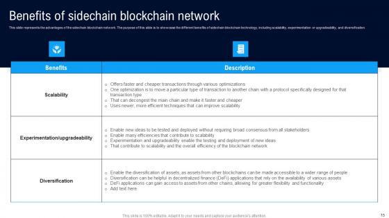 This slide represents the advantages of the sidechain blockchain network. The purpose of this slide is to showcase the different benefits of sidechain blockchain technology, including scalability, experimentation or upgradeability, and diversification. Take your projects to the next level with our ultimate collection of Benefits Of Sidechain Blockchain Different Architectures Of Blockchain Infographics Pdf. Slidegeeks has designed a range of layouts that are perfect for representing task or activity duration, keeping track of all your deadlines at a glance. Tailor these designs to your exact needs and give them a truly corporate look with your own brand colors they will make your projects stand out from the rest This slide represents the advantages of the sidechain blockchain network. The purpose of this slide is to showcase the different benefits of sidechain blockchain technology, including scalability, experimentation or upgradeability, and diversification.