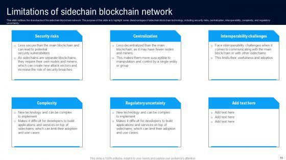 This slide outlines the drawbacks of the sidechain blockchain network. The purpose of this slide is to highlight some disadvantages of sidechain blockchain technology, including security risks, centralization, interoperability, complexity, and regulatory uncertainty. Do you have to make sure that everyone on your team knows about any specific topic I yes, then you should give Limitations Sidechain Blockchain Different Architectures Of Blockchain Professional Pdf a try. Our experts have put a lot of knowledge and effort into creating this impeccable Limitations Sidechain Blockchain Different Architectures Of Blockchain Professional Pdf. You can use this template for your upcoming presentations, as the slides are perfect to represent even the tiniest detail. You can download these templates from the Slidegeeks website and these are easy to edit. So grab these today This slide outlines the drawbacks of the sidechain blockchain network. The purpose of this slide is to highlight some disadvantages of sidechain blockchain technology, including security risks, centralization, interoperability, complexity, and regulatory uncertainty.
