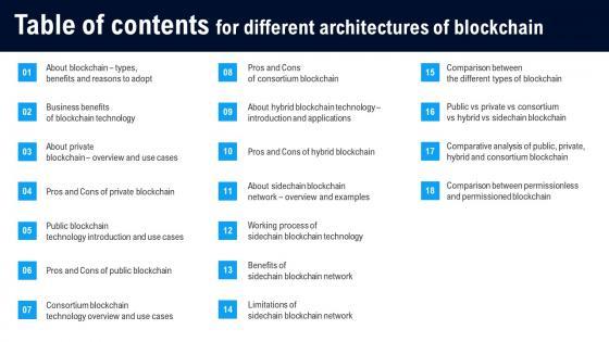 Do you have an important presentation coming up Are you looking for something that will make your presentation stand out from the rest Look no further than Table Of Contents For Different Architectures Of Blockchain Microsoft Pdf. With our professional designs, you can trust that your presentation will pop and make delivering it a smooth process. And with Slidegeeks, you can trust that your presentation will be unique and memorable. So why wait Grab Table Of Contents For Different Architectures Of Blockchain Microsoft Pdf today and make your presentation stand out from the rest Our Table Of Contents For Different Architectures Of Blockchain Microsoft Pdf are topically designed to provide an attractive backdrop to any subject. Use them to look like a presentation pro.