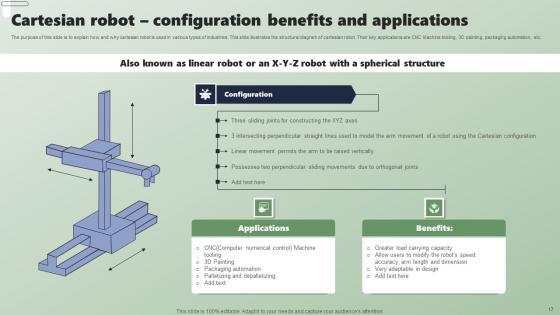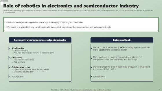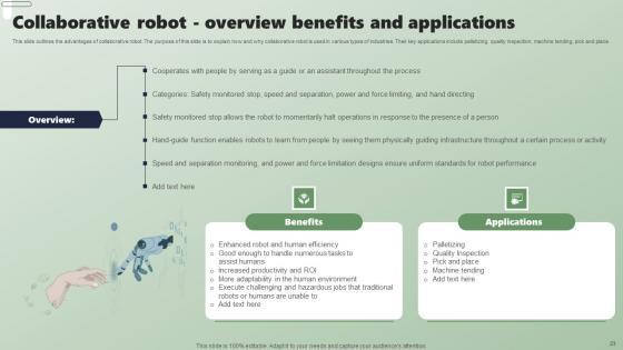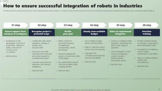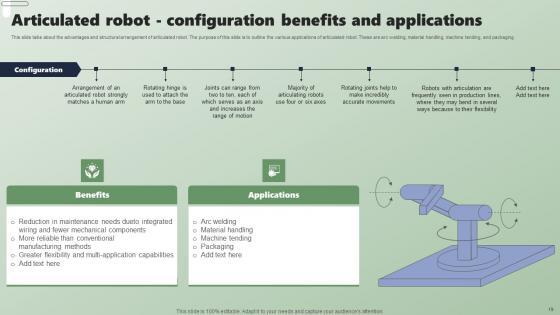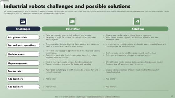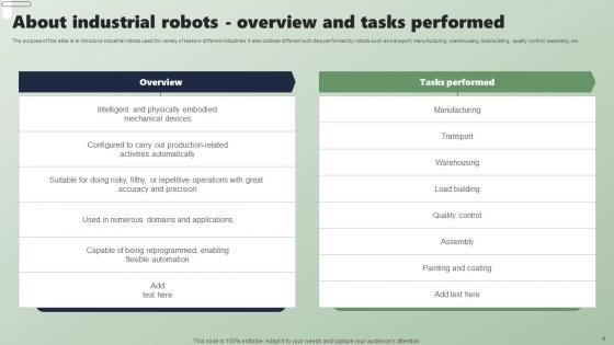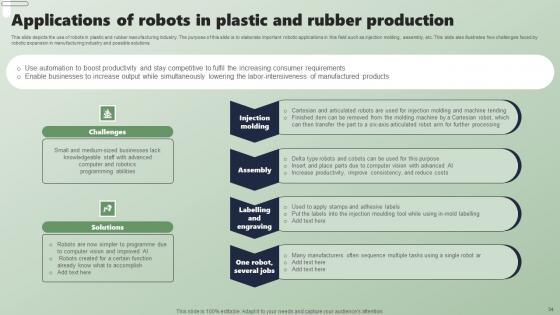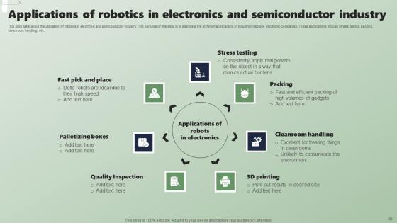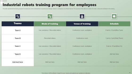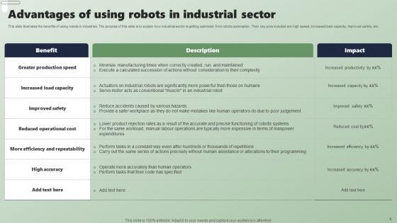 This Applications Of Industrial Robots In Different Sectors Ppt PowerPoint Presentation Complete Deck With Slides is a primer on how to capitalize on business opportunities through planning, innovation, and market intelligence. The content-ready format of the complete deck will make your job as a decision-maker a lot easier. Use this ready-made PowerPoint Template to help you outline an extensive and legible plan to capture markets and grow your company on the right path, at an exponential pace. What is even more amazing is that this presentation is completely editable and 100 percent customizable. This sixty eight slide complete deck helps you impress a roomful of people with your expertise in business and even presentation. Craft such a professional and appealing presentation for that amazing recall value. Download now. Our Applications Of Industrial Robots In Different Sectors Ppt PowerPoint Presentation Complete Deck With Slides are topically designed to provide an attractive backdrop to any subject. Use them to look like a presentation pro.