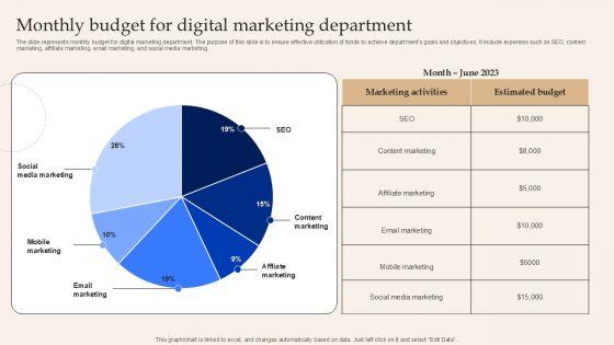 The slide represents monthly budget for digital marketing department. The purpose of this slide is to ensure effective utilization of funds to achieve departments goals and objectives. It include expenses such as SEO, content marketing, affiliate marketing, email marketing, and social media marketing. Showcasing this set of slides titled Monthly Budget For Digital Marketing Department Elements PDF. The topics addressed in these templates are Social Media Marketing, Mobile Marketing, Email Marketing. All the content presented in this PPT design is completely editable. Download it and make adjustments in color, background, font etc. as per your unique business setting.