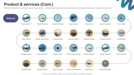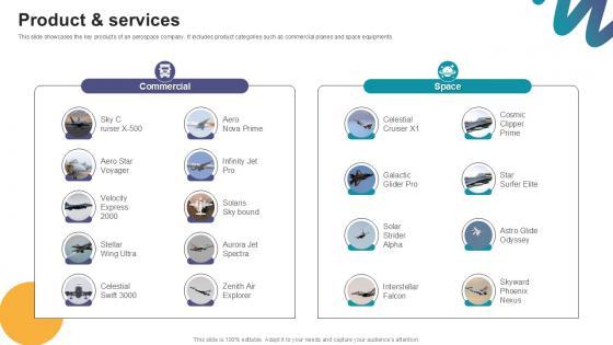 This slide showcases the key products of an aerospace company. It includes product categories such as commercial planes and space equipments. Here you can discover an assortment of the finest PowerPoint and Google Slides templates. With these templates, you can create presentations for a variety of purposes while simultaneously providing your audience with an eye-catching visual experience. Download Product And Services Digital Marketings Strategies PPT Sample CP SS V to deliver an impeccable presentation. These templates will make your job of preparing presentations much quicker, yet still, maintain a high level of quality. Slidegeeks has experienced researchers who prepare these templates and write high-quality content for you. Later on, you can personalize the content by editing the Product And Services Digital Marketings Strategies PPT Sample CP SS V. This slide showcases the key products of an aerospace company. It includes product categories such as commercial planes and space equipments.