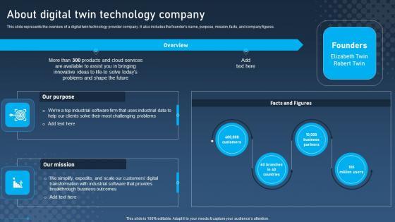 This slide represents the overview of a digital twin technology provider company. It also includes the founders name, purpose, mission, facts, and company figures. Boost your pitch with our creative About Digital Twin Technology Company Digital Twins For Enhanced Industrial Slides Pdf. Deliver an awe-inspiring pitch that will mesmerize everyone. Using these presentation templates you will surely catch everyones attention. You can browse the ppts collection on our website. We have researchers who are experts at creating the right content for the templates. So you do not have to invest time in any additional work. Just grab the template now and use them. This slide represents the overview of a digital twin technology provider company. It also includes the founders name, purpose, mission, facts, and company figures.