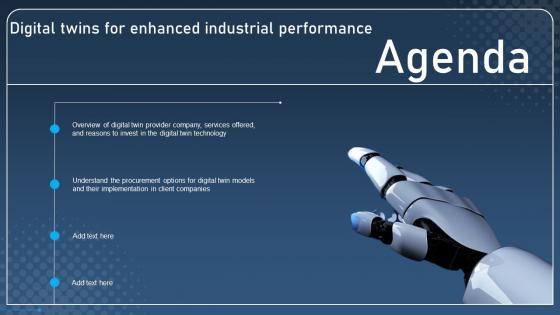 Create an editable Agenda Digital Twins For Enhanced Industrial Performance Information Pdf that communicates your idea and engages your audience. Whether you are presenting a business or an educational presentation, pre-designed presentation templates help save time. Agenda Digital Twins For Enhanced Industrial Performance Information Pdf is highly customizable and very easy to edit, covering many different styles from creative to business presentations. Slidegeeks has creative team members who have crafted amazing templates. So, go and get them without any delay. Our Agenda Digital Twins For Enhanced Industrial Performance Information Pdf are topically designed to provide an attractive backdrop to any subject. Use them to look like a presentation pro.