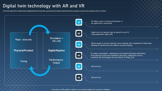 This slide depicts the relationship of digital twin technology with augmented and virtual reality that allows people to see the inner workings of any machine. This modern and well-arranged Digital Twin Technology With AR And VR Digital Twins For Enhanced Industrial Themes Pdf provides lots of creative possibilities. It is very simple to customize and edit with the Powerpoint Software. Just drag and drop your pictures into the shapes. All facets of this template can be edited with Powerpoint no extra software is necessary. Add your own material, put your images in the places assigned for them, adjust the colors, and then you can show your slides to the world, with an animated slide included. This slide depicts the relationship of digital twin technology with augmented and virtual reality that allows people to see the inner workings of any machine.
