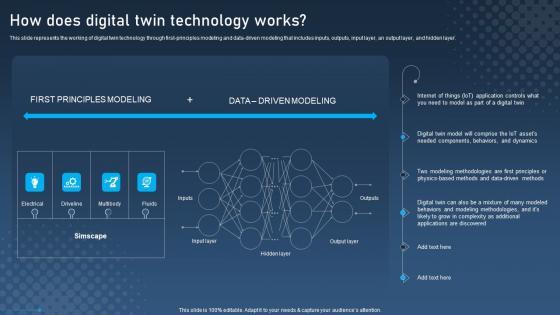 This slide represents the working of digital twin technology through first-principles modeling and data-driven modeling that includes inputs, outputs, input layer, an output layer, and hidden layer. Welcome to our selection of the How Does Digital Twin Technology Works Digital Twins For Enhanced Industrial Topics Pdf. These are designed to help you showcase your creativity and bring your sphere to life. Planning and Innovation are essential for any business that is just starting out. This collection contains the designs that you need for your everyday presentations. All of our PowerPoints are 100 percent editable, so you can customize them to suit your needs. This multi-purpose template can be used in various situations. Grab these presentation templates today. This slide represents the working of digital twin technology through first-principles modeling and data-driven modeling that includes inputs, outputs, input layer, an output layer, and hidden layer.