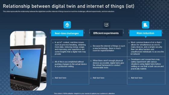 This slide represents the relationship between the digital twin and the internet of things based on real-time challenges, efficient experiments, and risk reduction. Do you know about Slidesgeeks Relationship Between Digital Twin And Internet Digital Twins For Enhanced Industrial Portrait Pdf These are perfect for delivering any kind od presentation. Using it, create PowerPoint presentations that communicate your ideas and engage audiences. Save time and effort by using our pre-designed presentation templates that are perfect for a wide range of topic. Our vast selection of designs covers a range of styles, from creative to business, and are all highly customizable and easy to edit. Download as a PowerPoint template or use them as Google Slides themes. This slide represents the relationship between the digital twin and the internet of things based on real-time challenges, efficient experiments, and risk reduction.