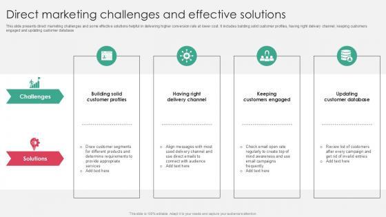 This slide presents direct marketing challenges and some effective solutions helpful in delivering higher conversion rate at lower cost. It includes building solid customer profiles, having right delivery channel, keeping customers engaged and updating customer database. Get a simple yet stunning designed Direct Marketing Challenges And Effective Solutions PPT Sample SS. It is the best one to establish the tone in your meetings. It is an excellent way to make your presentations highly effective. So, download this PPT today from Slidegeeks and see the positive impacts. Our easy-to-edit Direct Marketing Challenges And Effective Solutions PPT Sample SS can be your go-to option for all upcoming conferences and meetings. So, what are you waiting for Grab this template today. This slide presents direct marketing challenges and some effective solutions helpful in delivering higher conversion rate at lower cost. It includes building solid customer profiles, having right delivery channel, keeping customers engaged and updating customer database