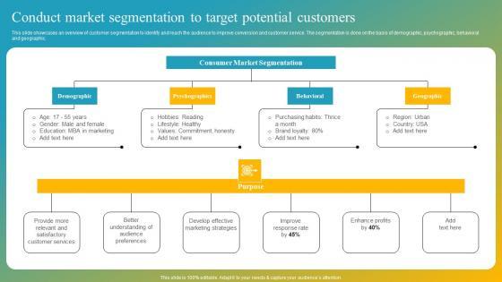 This slide showcases an overview of customer segmentation to identify and reach the audience to improve conversion and customer service. The segmentation is done on the basis of demographic, psychographic, behavioral and geographic. Slidegeeks is here to make your presentations a breeze with Effective Customer Engagement With Direct Response Conduct Market Segmentation Ideas Pdf With our easy-to-use and customizable templates, you can focus on delivering your ideas rather than worrying about formatting. With a variety of designs to choose from, you are sure to find one that suits your needs. And with animations and unique photos, illustrations, and fonts, you can make your presentation pop. So whether you are giving a sales pitch or presenting to the board, make sure to check out Slidegeeks first. This slide showcases an overview of customer segmentation to identify and reach the audience to improve conversion and customer service. The segmentation is done on the basis of demographic, psychographic, behavioral and geographic.
