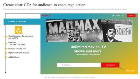 This slide provides an overview of the CTA that encourage audiences to take action. It further includes the benefits which are improve conversion rate, influence client decision, increase sales and improve site visit. Whether you have daily or monthly meetings, a brilliant presentation is necessary. Effective Customer Engagement With Direct Response Create Clear Cta For Audience Graphics Pdf can be your best option for delivering a presentation. Represent everything in detail using Effective Customer Engagement With Direct Response Create Clear Cta For Audience Graphics Pdf and make yourself stand out in meetings. The template is versatile and follows a structure that will cater to your requirements. All the templates prepared by Slidegeeks are easy to download and edit. Our research experts have taken care of the corporate themes as well. So, give it a try and see the results. This slide provides an overview of the CTA that encourage audiences to take action. It further includes the benefits which are improve conversion rate, influence client decision, increase sales and improve site visit.