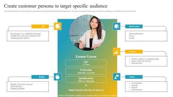 This slide depicts the customer persona created to understand client needs and preferences. The persona includes habits, age, profession, qualification, motivation, desires and values. Find highly impressive Effective Customer Engagement With Direct Response Create Customer Persona Background Pdf on Slidegeeks to deliver a meaningful presentation. You can save an ample amount of time using these presentation templates. No need to worry to prepare everything from scratch because Slidegeeks experts have already done a huge research and work for you. You need to download Effective Customer Engagement With Direct Response Create Customer Persona Background Pdf for your upcoming presentation. All the presentation templates are 100 percent editable and you can change the color and personalize the content accordingly. Download now. This slide depicts the customer persona created to understand client needs and preferences. The persona includes habits, age, profession, qualification, motivation, desires and values.