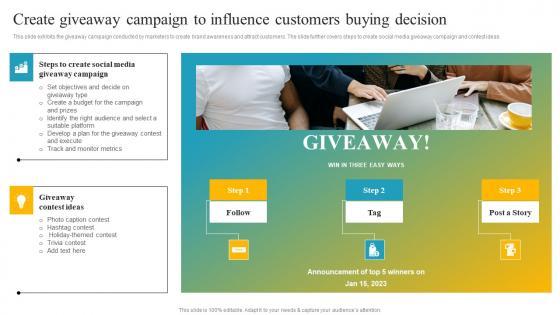 This slide exhibits the giveaway campaign conducted by marketers to create brand awareness and attract customers. The slide further covers steps to create social media giveaway campaign and contest ideas. If your project calls for a presentation, then Slidegeeks is your go-to partner because we have professionally designed, easy-to-edit templates that are perfect for any presentation. After downloading, you can easily edit Effective Customer Engagement With Direct Response Create Giveaway Campaign Introduction Pdf and make the changes accordingly. You can rearrange slides or fill them with different images. Check out all the handy templates This slide exhibits the giveaway campaign conducted by marketers to create brand awareness and attract customers. The slide further covers steps to create social media giveaway campaign and contest ideas.