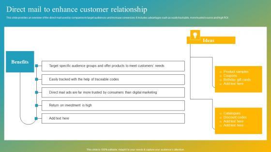 This slide provides an overview of the direct mail used by companies to target audiences and increase conversion. It includes advantages such as easily trackable, more trusted source and high ROI. Formulating a presentation can take up a lot of effort and time, so the content and message should always be the primary focus. The visuals of the PowerPoint can enhance the presenters message, so our Effective Customer Engagement With Direct Response Direct Mail To Enhance Customer Information Pdf was created to help save time. Instead of worrying about the design, the presenter can concentrate on the message while our designers work on creating the ideal templates for whatever situation is needed. Slidegeeks has experts for everything from amazing designs to valuable content, we have put everything into Effective Customer Engagement With Direct Response Direct Mail To Enhance Customer Information Pdf. This slide provides an overview of the direct mail used by companies to target audiences and increase conversion. It includes advantages such as easily trackable, more trusted source and high ROI.