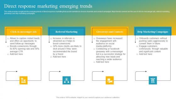 This slide provides insight into the emerging trends of direct response marketing that assist marketers to choose channels and conduct campaigns. Major trends covered are the use of click-to-messenger ads, referral marketing, giveaways and drip marketing campaigns. Coming up with a presentation necessitates that the majority of the effort goes into the content and the message you intend to convey. The visuals of a PowerPoint presentation can only be effective if it supplements and supports the story that is being told. Keeping this in mind our experts created Effective Customer Engagement With Direct Response Direct Response Marketing Demonstration Pdf to reduce the time that goes into designing the presentation. This way, you can concentrate on the message while our designers take care of providing you with the right template for the situation. This slide provides insight into the emerging trends of direct response marketing that assist marketers to choose channels and conduct campaigns. Major trends covered are the use of click-to-messenger ads, referral marketing, giveaways and drip marketing campaigns.