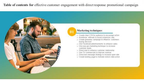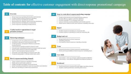 Retrieve professionally designed Effective Customer Engagement With Direct Response Promotional Table Of Contents Graphics Pdf to effectively convey your message and captivate your listeners. Save time by selecting pre-made slideshows that are appropriate for various topics, from business to educational purposes. These themes come in many different styles, from creative to corporate, and all of them are easily adjustable and can be edited quickly. Access them as PowerPoint templates or as Google Slides themes. You do not have to go on a hunt for the perfect presentation because Slidegeeks got you covered from everywhere. Our Effective Customer Engagement With Direct Response Promotional Table Of Contents Graphics Pdf are topically designed to provide an attractive backdrop to any subject. Use them to look like a presentation pro.