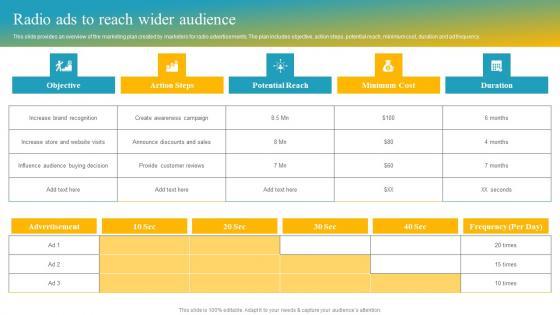 This slide provides an overview of the marketing plan created by marketers for radio advertisements. The plan includes objective, action steps, potential reach, minimum cost, duration and ad frequency. Here you can discover an assortment of the finest PowerPoint and Google Slides templates. With these templates, you can create presentations for a variety of purposes while simultaneously providing your audience with an eye-catching visual experience. Download Effective Customer Engagement With Direct Response Radio Ads To Reach Wider Professional Pdf to deliver an impeccable presentation. These templates will make your job of preparing presentations much quicker, yet still, maintain a high level of quality. Slidegeeks has experienced researchers who prepare these templates and write high-quality content for you. Later on, you can personalize the content by editing the Effective Customer Engagement With Direct Response Radio Ads To Reach Wider Professional Pdf. This slide provides an overview of the marketing plan created by marketers for radio advertisements. The plan includes objective, action steps, potential reach, minimum cost, duration and ad frequency.