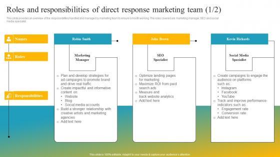 This slide provides an overview of the responsibilities handled and managed by marketing team to ensure smooth working. The roles covered are marketing manager, SEO and social media specialist. This Effective Customer Engagement With Direct Response Roles And Responsibilities Of Direct Themes Pdf from Slidegeeks makes it easy to present information on your topic with precision. It provides customization options, so you can make changes to the colors, design, graphics, or any other component to create a unique layout. It is also available for immediate download, so you can begin using it right away. Slidegeeks has done good research to ensure that you have everything you need to make your presentation stand out. Make a name out there for a brilliant performance. This slide provides an overview of the responsibilities handled and managed by marketing team to ensure smooth working. The roles covered are marketing manager, SEO and social media specialist.
