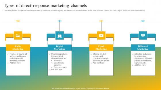 This slide provides insight into the channels used by marketers to create urgency and influence customers to take action. The channels covered are radio, digital, email and billboard marketing. Take your projects to the next level with our ultimate collection of Effective Customer Engagement With Direct Response Types Of Direct Response Background Pdf. Slidegeeks has designed a range of layouts that are perfect for representing task or activity duration, keeping track of all your deadlines at a glance. Tailor these designs to your exact needs and give them a truly corporate look with your own brand colors they well make your projects stand out from the rest. This slide provides insight into the channels used by marketers to create urgency and influence customers to take action. The channels covered are radio, digital, email and billboard marketing.