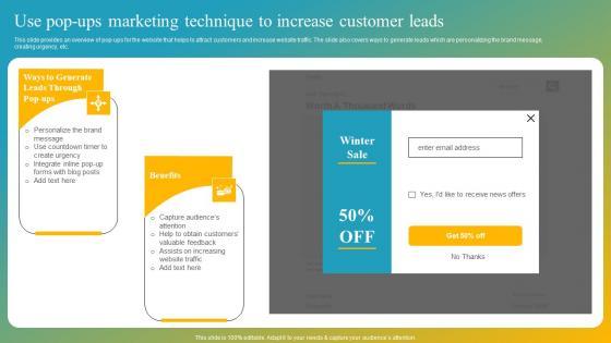 This slide provides an overview of pop-ups for the website that helps to attract customers and increase website traffic. The slide also covers ways to generate leads which are personalizing the brand message, creating urgency, etc. Find a pre-designed and impeccable Effective Customer Engagement With Direct Response Use Pop Ups Marketing Demonstration Pdf. The templates can ace your presentation without additional effort. You can download these easy-to-edit presentation templates to make your presentation stand out from others. So, what are you waiting for Download the template from Slidegeeks today and give a unique touch to your presentation. This slide provides an overview of pop-ups for the website that helps to attract customers and increase website traffic. The slide also covers ways to generate leads which are personalizing the brand message, creating urgency, etc.