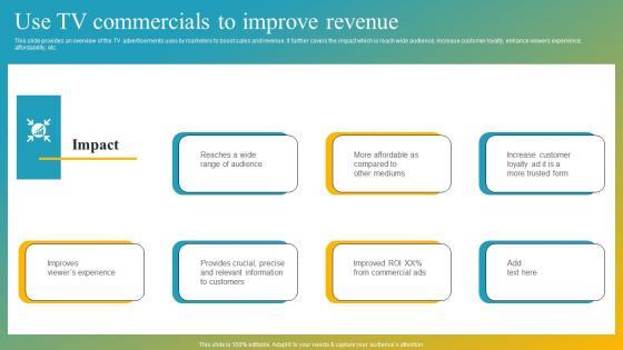 This slide provides an overview of the TV advertisements uses by marketers to boost sales and revenue. It further covers the impact which is reach wide audience, increase customer loyalty, enhance viewers experience, affordability, etc. Boost your pitch with our creative Effective Customer Engagement With Direct Response Use Tv Commercials To Improve Pictures Pdf. Deliver an awe-inspiring pitch that will mesmerize everyone. Using these presentation templates you will surely catch everyones attention. You can browse the ppts collection on our website. We have researchers who are experts at creating the right content for the templates. So you do not have to invest time in any additional work. Just grab the template now and use them. This slide provides an overview of the TV advertisements uses by marketers to boost sales and revenue. It further covers the impact which is reach wide audience, increase customer loyalty, enhance viewers experience, affordability, etc.