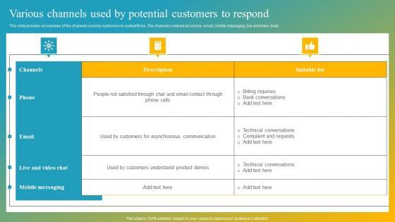 This slide provides an overview of the channels used by customers to contact firms. The channels covered are phone, email, mobile messaging, live and video chats. Create an editable Effective Customer Engagement With Direct Response Various Channels Used Microsoft Pdf that communicates your idea and engages your audience. Whether you are presenting a business or an educational presentation, pre-designed presentation templates help save time. Effective Customer Engagement With Direct Response Various Channels Used Microsoft Pdf is highly customizable and very easy to edit, covering many different styles from creative to business presentations. Slidegeeks has creative team members who have crafted amazing templates. So, go and get them without any delay. This slide provides an overview of the channels used by customers to contact firms. The channels covered are phone, email, mobile messaging, live and video chats.