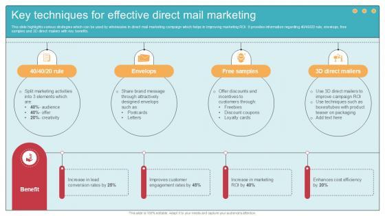 This slide highlights various strategies which can be used by wholesales in direct mail marketing campaign which helps in improving marketing ROI. It provides information regarding 40-40-20 rule, envelops, free samples and 3D direct mailers with key benefits. Are you in need of a template that can accommodate all of your creative concepts This one is crafted professionally and can be altered to fit any style. Use it with Google Slides or PowerPoint. Include striking photographs, symbols, depictions, and other visuals. Fill, move around, or remove text boxes as desired. Test out color palettes and font mixtures. Edit and save your work, or work with colleagues. Download Key Techniques For Effective Direct Comprehensive Guide To Wholesale Ppt Presentation and observe how to make your presentation outstanding. Give an impeccable presentation to your group and make your presentation unforgettable. This slide highlights various strategies which can be used by wholesales in direct mail marketing campaign which helps in improving marketing ROI. It provides information regarding 40-40-20 rule, envelops, free samples and 3D direct mailers with key benefits.