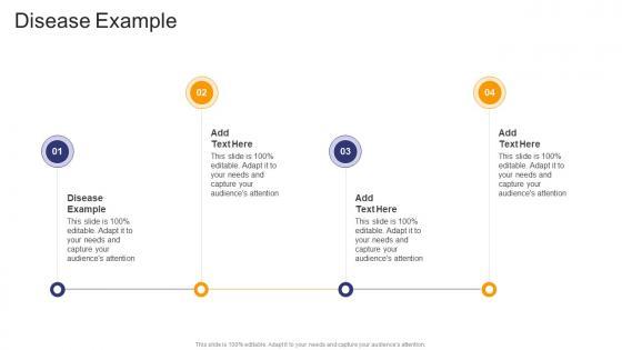 Introducing our well-designed Disease Example In Powerpoint And Google Slides Cpb This PowerPoint design presents information on topics like Disease Example As it is predesigned it helps boost your confidence level. It also makes you a better presenter because of its high-quality content and graphics. This PPT layout can be downloaded and used in different formats like PDF, PNG, and JPG. Not only this, it is available in both Standard Screen and Widescreen aspect ratios for your convenience. Therefore, click on the download button now to persuade and impress your audience. Our Disease Example In Powerpoint And Google Slides Cpb are topically designed to provide an attractive backdrop to any subject. Use them to look like a presentation pro.