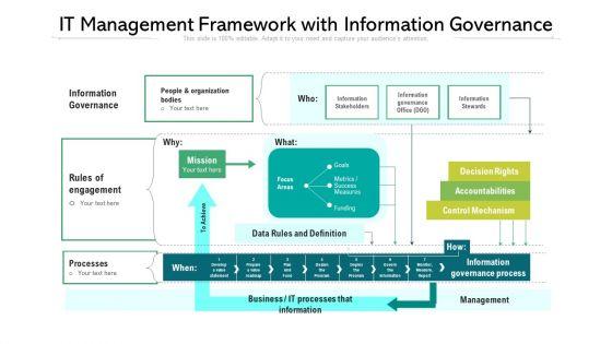 Pitch your topic with ease and precision using this IT management framework with information governanace ppt powerpoint presentation gallery display pdf. This layout presents information on information governance, rules of engagement, people and organization bodies, information stakeholders, information stewards . It is also available for immediate download and adjustment. So, changes can be made in the colour, design, graphics or any other component to create a unique layout.