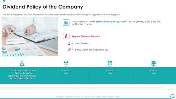 The slide provides POST IPO Dividend Distribution Policy of the company which covers the type and different ways or methods of dividend payment. This is a dividend policy of the company deal pitchbook ipo graphics pdf template with various stages. Focus and dispense information on two stages using this creative set, that comes with editable features. It contains large content boxes to add your information on topics like payment, cost, profit. You can also showcase facts, figures, and other relevant content using this PPT layout. Grab it now.