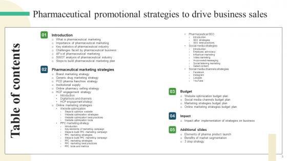 Slidegeeks is one of the best resources for PowerPoint templates. You can download easily and regulate Pharmaceutical Promotional Strategies To Drive Business Sales Table Of Contents Sample Pdf for your personal presentations from our wonderful collection. A few clicks is all it takes to discover and get the most relevant and appropriate templates. Use our Templates to add a unique zing and appeal to your presentation and meetings. All the slides are easy to edit and you can use them even for advertisement purposes. Our Pharmaceutical Promotional Strategies To Drive Business Sales Table Of Contents Sample Pdf are topically designed to provide an attractive backdrop to any subject. Use them to look like a presentation pro.