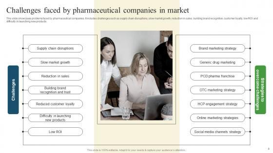 This slide showcases problems faced by pharmaceutical companies. It includes challenges such as supply chain disruptions, slow market growth, reduction in sales, building brand recognition, customer loyalty, low ROI and difficulty in launching new products. Do you have an important presentation coming up Are you looking for something that will make your presentation stand out from the rest Look no further than Challenges Faced Pharmaceutical Companies Pharmaceutical Promotional Strategies Drive Business Sales Ideas Pdf. With our professional designs, you can trust that your presentation will pop and make delivering it a smooth process. And with Slidegeeks, you can trust that your presentation will be unique and memorable. So why wait Grab Challenges Faced Pharmaceutical Companies Pharmaceutical Promotional Strategies Drive Business Sales Ideas Pdf today and make your presentation stand out from the rest This slide showcases problems faced by pharmaceutical companies. It includes challenges such as supply chain disruptions, slow market growth, reduction in sales, building brand recognition, customer loyalty, low ROI and difficulty in launching new products.
