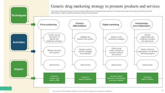 This slide showcases the generic drug marketing method to promote product and services. It includes techniques such as price positioning, product differentiation, digital marketing and partnerships and collaborations. Formulating a presentation can take up a lot of effort and time, so the content and message should always be the primary focus. The visuals of the PowerPoint can enhance the presenters message, so our Generic Drug Marketing Strategy Pharmaceutical Promotional Strategies To Drive Business Sales Elements Pdf was created to help save time. Instead of worrying about the design, the presenter can concentrate on the message while our designers work on creating the ideal templates for whatever situation is needed. Slidegeeks has experts for everything from amazing designs to valuable content, we have put everything into Generic Drug Marketing Strategy Pharmaceutical Promotional Strategies To Drive Business Sales Elements Pdf This slide showcases the generic drug marketing method to promote product and services. It includes techniques such as price positioning, product differentiation, digital marketing and partnerships and collaborations.