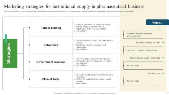 This slide showcases marketing strategies for institutional supplies to enhance business. It includes strategies such as tender bidding, networking, government relations and clinical trials. Presenting this PowerPoint presentation, titled Marketing Strategies Institutional Pharmaceutical Promotional Strategies Drive Business Sales Download Pdf, with topics curated by our researchers after extensive research. This editable presentation is available for immediate download and provides attractive features when used. Download now and captivate your audience. Presenting this Marketing Strategies Institutional Pharmaceutical Promotional Strategies Drive Business Sales Download Pdf. Our researchers have carefully researched and created these slides with all aspects taken into consideration. This is a completely customizable Marketing Strategies Institutional Pharmaceutical Promotional Strategies Drive Business Sales Download Pdf that is available for immediate downloading. Download now and make an impact on your audience. Highlight the attractive features available with our PPTs. This slide showcases marketing strategies for institutional supplies to enhance business. It includes strategies such as tender bidding, networking, government relations and clinical trials.