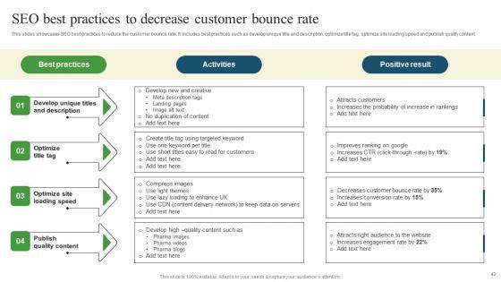This slides showcases SEO best practices to reduce the customer bounce rate. It includes best practices such as develop unique title and description, optimize title tag, optimize site loading speed and publish quality content. From laying roadmaps to briefing everything in detail, our templates are perfect for you. You can set the stage with your presentation slides. All you have to do is download these easy to edit and customizable templates. Seo Best Practices To Decrease Pharmaceutical Promotional Strategies To Drive Business Sales Template Pdf will help you deliver an outstanding performance that everyone would remember and praise you for. Do download this presentation today. This slides showcases SEO best practices to reduce the customer bounce rate. It includes best practices such as develop unique title and description, optimize title tag, optimize site loading speed and publish quality content.