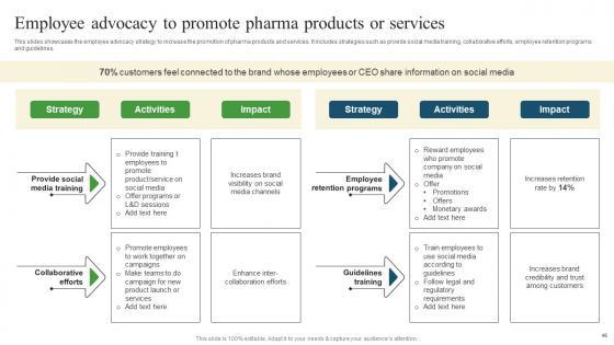 This slides showcases the employee advocacy strategy to increase the promotion of pharma products and services. It includes strategies such as provide social media training, collaborative efforts, employee retention programs and guidelines. Are you in need of a template that can accommodate all of your creative concepts This one is crafted professionally and can be altered to fit any style. Use it with Google Slides or PowerPoint. Include striking photographs, symbols, depictions, and other visuals. Fill, move around, or remove text boxes as desired. Test out color palettes and font mixtures. Edit and save your work, or work with colleagues. Download Employee Advocacy To Promote Pharmaceutical Promotional Strategies To Drive Business Sales Icons Pdf and observe how to make your presentation outstanding. Give an impeccable presentation to your group and make your presentation unforgettable. This slides showcases the employee advocacy strategy to increase the promotion of pharma products and services. It includes strategies such as provide social media training, collaborative efforts, employee retention programs and guidelines.