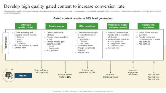 This slides showcases the strategies to develop creative gated content to enhance conversion rate. It includes strategies such as offer high quality content, easy to access, offer incentives, optimize for mobile and analyze result and comply with regulations. Whether you have daily or monthly meetings, a brilliant presentation is necessary. Develop High Quality Gated Pharmaceutical Promotional Strategies To Drive Business Sales Elements Pdf can be your best option for delivering a presentation. Represent everything in detail using Develop High Quality Gated Pharmaceutical Promotional Strategies To Drive Business Sales Elements Pdf and make yourself stand out in meetings. The template is versatile and follows a structure that will cater to your requirements. All the templates prepared by Slidegeeks are easy to download and edit. Our research experts have taken care of the corporate themes as well. So, give it a try and see the results. This slides showcases the strategies to develop creative gated content to enhance conversion rate. It includes strategies such as offer high quality content, easy to access, offer incentives, optimize for mobile and analyze result and comply with regulations.